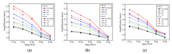 The acceleration peak amplification factor was defined as the ratio of the peak acceleration collected by the measuring point to the input peak acceleration [26,32,33]. The distribution diagram of the amplification factor of each cross-section measuring point under the four test conditions is shown in Figure 8. When PGA was 0.1–0.4 g, the amplification factor decreases uniformly. When PGA was 0.4–0.8 g, the amplification coefficient decreased sharply. This was because in the early stage of vibration, the surrounding rock underwent a large movement, and the input PGA value was high, leading to the nonlinear development of surrounding rock and an increase in the damping and energy dissipation of surrounding rock. On different sections, the magnification factor of each test condition in Figure 8b was greater than that in Figure 8a,c, which was related to the location of fault C–C. The fault worsened the constraint effect of the surrounding rock and strengthened the tunnel response. Smaller fault dips resulted in larger magnification factors. Because the contact area between the fault and the tunnel increases as the dip angle decreases, a smaller distance between the fault tunnel led to a greater acceleration response.