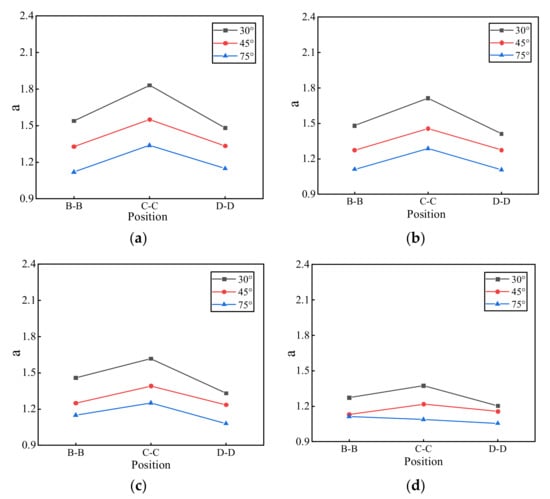 The acceleration peak ratio α was defined as the ratio of the output acceleration peak value of the fault–crossing tunnels and the ordinary tunnel at the same measuring point. Figure 9 shows a graph of acceleration peak ratios under different test conditions and under different input PGAs. Figure 9a is a graph of the peak acceleration ratio of different test conditions on each section when the input PGA was 0.1 g. The figure shows that the three curves all have a triangular distribution; thus, a large value of α on the section C–C means that the vibration response at the fault was relatively strong. The dip angle was the largest at 30°, followed by 45°, and the smallest at 75°; the maximum was 1.83. Figure 9b–d show the acceleration peak ratio graphs when the PGA was 0.2 g, 0.4 g, and 0.6 g, respectively. As the PGA increased, the distribution law of the α value remained unchanged, but the α value continued to decrease. Therefore, the response at the fault is strong, and as the dip of the fault decreased, this effect became more pronounced. Cracks could be easily produced and cause structural damage, and the seismic design of the tunnel was unfavorable.