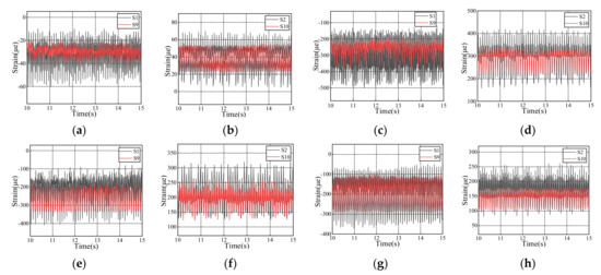 Strain–time history curve under different test conditions. (a) Crown of ordinary tunnel; (b) invert of ordinary tunnel; (c) crown of the tunnel with a fault angle of 30°; (d) invert of the tunnel with a fault angle of 30°; (e) crown of the tunnel with a fault angle of 45°; (f) invert of the tunnel with a fault angle of 45°; (g) crown of the tunnel with a fault angle of 75°; and (h) invert of the tunnel with a fault angle of 75°.