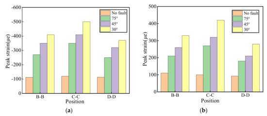 Therefore, according to Figure 11a,b, taking the peak strain of the ordinary tunnel as the control group, the increase amplitude of the peak strain at different inclination angles was calculated (Table 8 and Table 9). When the dip angle was 75° at the crown, the increase range in the peak strain was 212–292% (Table 8). When the dip angle was 45°, the increase range was 283–342%. When the dip angle was 30°, the increase range was 327–417%. When the dip angle was 75°, the peak strain increase range was 191–270% (Table 9). When the dip angle was 45°, the increase range was 228–320%. When the dip angle was 30°, the increase range was 300–420%. The above data reveal that there was little difference in the increase range of the dip angles of 75° and 45°, but the increase range was greatly increased from 45° to 30°. This shows that the strain response of the tunnel was more sensitive to the dip angle of the fault. A smaller dip angle led to a greater increase in the peak strain.