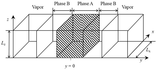 An NVE molecular dynamics simulation of symmetric binary Lennard–Jones LJ fluids was used in this study. We used a self-developed molecular dynamics simulation code. A sandwich-structured liquid film consisting of three layers of LJ (12, 6) fluids in a rectangular cell was simulated as shown in Figure 1. A membrane of LJ liquid was placed in the center of the y-direction and sandwiched by membranes of the other LJ liquid from both ends. Truncated and shifted LJ argon was used for the particles. A system was set up comprising 3200 LJ argon “A” particles and 6400 LJ argon “B” particles. The intermolecular interaction parameter for homologous LJ argon “A” and “B” were set as εAA/kB = εBB/kB = 120.0 K, σAA = σBB = σAB = 0.34 nm, where kB is Boltmann’s constant. The cutoff distance was 5.0 σAA, which was sufficiently large to represent particles using the full LJ potential [27]. The masses of LJ argon “A” and “B” were 6.636 × 10–26 kg [50]. The MD simulations were conducted in a box with dimensions of Lx × Ly × Lz = 14.0 σAA × 120.0 σAA × 15.2 σAA, which was sufficiently large to give a correct value for the surface tension [25,27].