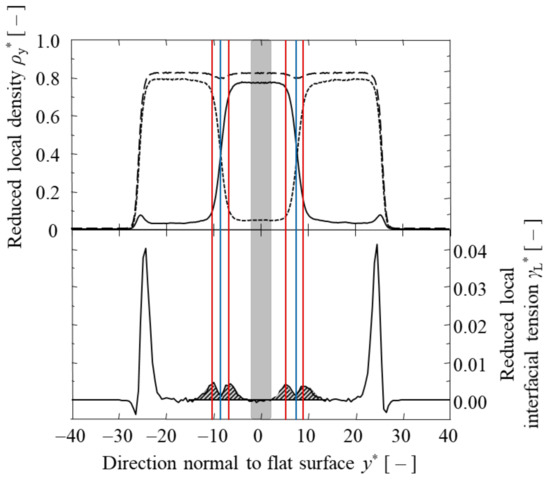 MD simulations were conducted for several combinations of α and T* to obtain the LJ liquid–liquid phase equilibrium. Typical distributions of local density and local surface tension are shown in Figure 2. The solid line shows the local density distribution of argon “A”, the dotted line is argon “B”, and the dashed line is the total density of the two argons “A” and “B”. In the bulk region of the argon “A” phase, the background is filled in with gray. The position where the local densities of argon “A” and “B” coincide is the equimolar dividing surface (blue lines). As shown in Figure 2, the local surface tension was almost zero at the equimolar dividing surfaces and, in the bulk phase of LJ argon “A” and “B”, was sufficiently far from the equimolar dividing surfaces. Two tension surfaces were present on both sides of each equimolar dividing surface (red lines). Incidentally, the large local interfacial tensions that occurred at the gas–liquid interface, as shown in Figure 2, were not considered in this study because they corresponded to the surface tensions of the gas–liquid interface. The four peaks integrated in the y-direction for the calculation of the interfacial tension γ* of two interfaces are filled in with shaded lines.