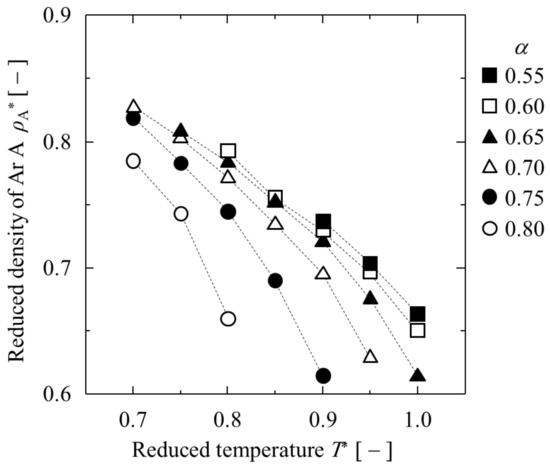 The obtained and are listed in Table 1 and shown in Figure 3 and Figure 4. At α = 0.50, each of the three argon LJ liquid films was isolated and did not contact with each other at all (“complete separation” is indicated in Table 1). When α was greater than 0.85, LJ argon “A and “B” were completely mixed without creating interfaces, even at T* = 0.70 (“complete mixture” is indicated in Table 1). Between α = 0.55 and 0.80, the partial mixing of LJ argon “A” and “B” was observed. Between α = 0.55 and 0.80, the greater the value of α, the lower the temperature required for partial mixing. For all α, when T* was higher than 1.05, no interface was observed at all due to the perfect mixing of heterogeneous LJ argons. For a smaller value of α, the weak interactions between the LJ heterogeneous argons prevented them from mixing at lower temperatures. In the high temperature region, the increase in entropy caused some mixing. The greater the value of α, the greater the depression in temperature for complete mixing. Therefore, when dealing with symmetric binary LJ liquids and conducting capillary phase separation in pores, it is necessary to use settings within this limited range of α and T*.