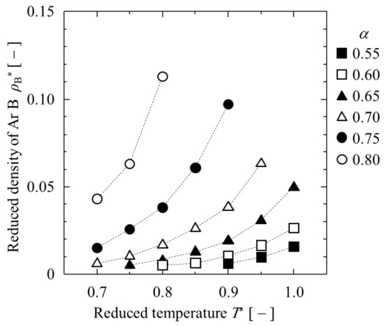As is well known, the phase diagram and physical properties of a one-component LJ fluid are non-dimensionalized by the LJ parameters ε and σ, such as T* and γ* [54]. Even for LJ materials with different ε and σ, the phase diagram and physical properties will be the same due to non-dimensionalization. On the other hand, TC indicates the temperature at which perfect mixing occurs and depends on α, the interaction strength between different LJ Ar. α is not involved in the non-dimensionalization of T* and γ*, and so such non-dimensionalization is not suitable for T/TC; thus, non-dimensionalization by ε and σ is not used here.