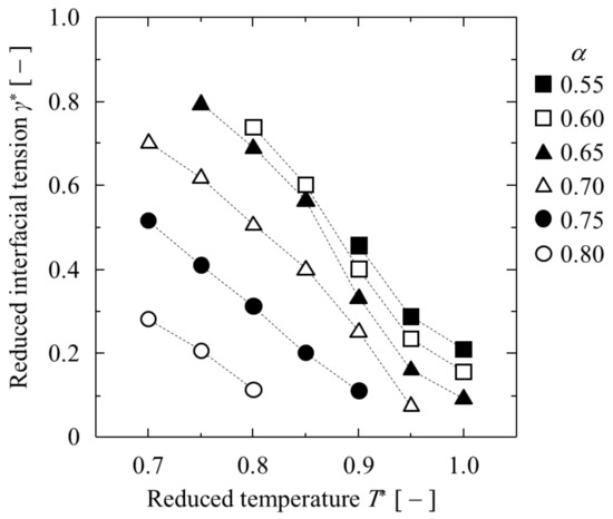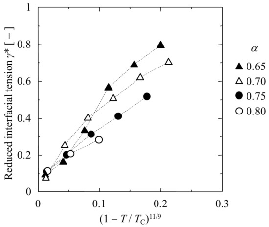 In Figure 10, the γ* and (1 − T/TC)11/9 relationship is shown in order to examine the applicability of the Guggenheim–Katayama equation for the interfacial tension of a binary LJ liquid system. In cases in which T is close to Tc and α = 0.65 or 0.70, the decay pattern becomes nonlinear and does not follow the Guggenheim–Katayama equation. Surprisingly, the proportionality of the Guggenheim–Katayama equation was almost valid for the MD simulation results for α = 0.75 or 0.80, even though it is a rather rough approximation.