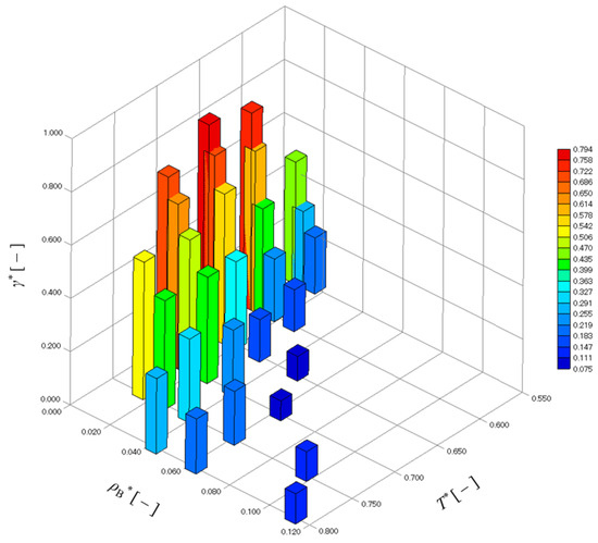 Figure 5 shows that γ* changed strongly under the influence of T*, but at the same time, also changed strongly under the influence of T*, as shown in Figure 4. In other words, since γ* may also be strongly affected by , the effects of and T* on γ* are shown in Figure 7. Comparing γ* between similar , γ* tends to be slightly larger with a higher T*, but the effect of T* on γ* is small. In contrast, the effect of the difference in on γ* is very large, and the larger is, the smaller γ* becomes.