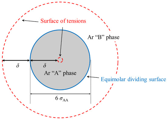 This implies that the usual concept of the interfacial tension of the binary LJ liquid–liquid at flat interfaces cannot be applied when nano-scale LJ droplets are surrounded by other LJ liquids. For example, as shown in Figure 8, when the diameter of the Ar “A” droplet is 6 σAA and δ is slightly smaller than 3 σAA, the internal surface of tension of the Ar “A” phase shrinks to about 1 σAA or less. Furthermore, inside the surface of tension with a diameter of σ, there is still a weak local interfacial tension, and the local interfacial tensions overlap in the face-to-face direction inside the surface of tension.