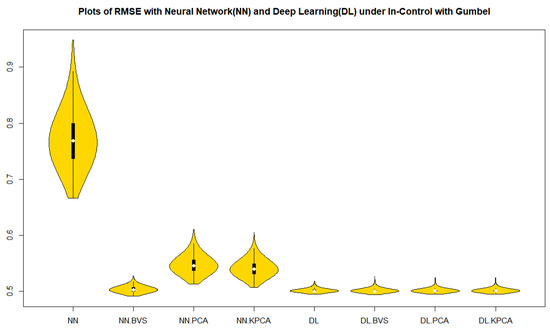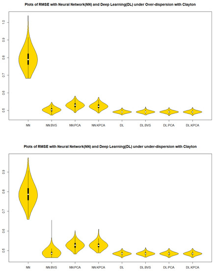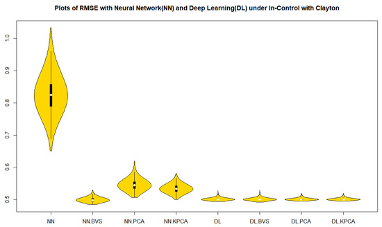 By using the Root MSE Formula (5), we performed the Root MSE of each simulated in-control data of sample size 1000 with 1000 repetitions in Table 1. It is a surprising result that the r-chart based on the deep learning models with BVS, PCS, NLPCS and whole data for both the Clayton and the Gumbel copulas show a superiority to all other cases in Table 1 in terms of the accuracy and precision by mean, median, and interquartile range (IQR).