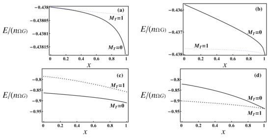 Hence, when , the lowest isospin is when k is odd, and when k is even. Let and . Figure 1 shows the lowest and level energies as functions of x for even shown in panel (a) and odd shown in panel (b) for , where the single-particle energy term is a constant and not involved in the plot. For the even k case, the level is with , while level is with when . The ground state in this case is always the lowest state. For the odd k case, on the contrary, there is a gap between the and levels, which gradually diminishes with the increasing of x. The and levels degenerate when leads to the ground state in this case. This feature persists in realistic systems as well. For example, panels (c,d) show and levels generated from (19) for and valence particles, respectively, in the -shell with , and orbits, for which the experimentally deduced single-particle energies above the O core with MeV, MeV, MeV [50], together with the nn- and pp-pairing strengths being set as MeV, are used. Due to the mean-field contribution, the energy gap between and levels is less changed with the variation of x for k even, in comparison to the single orbit case, even when , while the two levels still degenerate when for odd k case leading to the ground state.