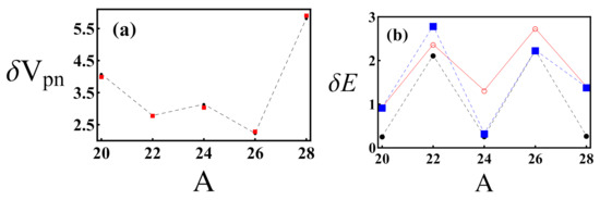 calculated by using the binding energies of both the related even–even and odd–odd nuclei Included in the fitting procedure, which shows that the experimental data are well-fit by the model Hamiltonian (26). Moreover, it is clearly shown in panel (a) of Figure 2 that becomes comparatively smaller for odd–odd N = Z nuclei with A = 22 and 26 in this case. Since the one- and two-body interaction dominating average binding energy term and the Coulomb energy term of (26) only contribute a Z and N independent constat to , the symmetry energy and the isospin-dependent part of the Wigner energy term seem to be the main source that alters the usual pairing gap staggering pattern, which is consistent to the claim made in [6] that the double-binding energy difference (31) actually reveals the evidence for the Wigner energy contribution to the binding, where the usual staggering pattern of the pairing gaps disappears [50]. Alternatively, instead of , we calculate the double pairing energy difference defined as