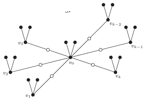 To better recognize connections between the independent domination number , the common independence number , and the independence number , we begin with simple examples. It is obvious that for every positive integer n. Similarly, if m and n are positive integers and , then . It is no problem to observe that , , and . Consequently, if and . On the other hand we have if . Let be a graph obtained from the corona by inserting a new vertex into each non-pendant edge of , see Figure 1. Now it is easy to see that , , , and if . Similarly, if denotes a graph obtained from the double star by inserting a new vertex into its only non-pendant edge, then it is obvious that , , and . From these examples it follows that the differences between numbers , , and can be arbitrarily large.
