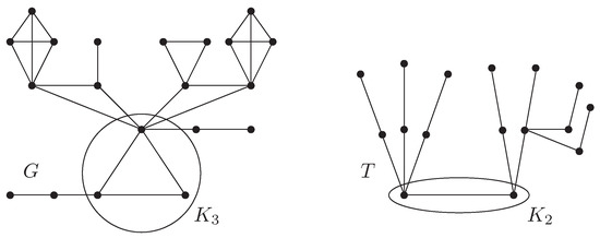 It is clear from the above definition that every graph belonging to the family is a block graph. Figure 2 shows a block graph G belonging to and a tree T that belongs to the subfamily of .