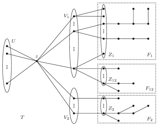 Let U and V denote the set and , respectively. We divide the set V into two sets and , where and . Let F denote the graph , and let be the set of all components of F. Let , , and be the subgraphs of F, where , , . By , , and we denote the sets , , and , respectively. Figure 4 shows a tree T, the subsets U, , , , , , and the subgraphs , , and of the well-covered forest .