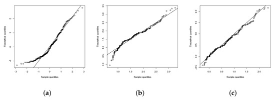 According to the AIC criterion, the best fit is presented by the model. To corroborate the good performance of the model, the proportion of the data set coming from units with low response was estimated. For the model without covariates the estimator of the Bernoulli intercept is 1.106, so that the estimator of the proportion of observations at or below the detection limit is which, compared to the observed , indicates good agreement with the proposed model.