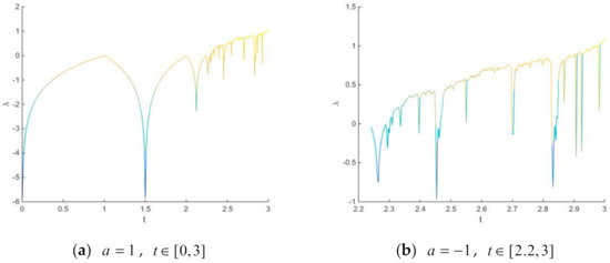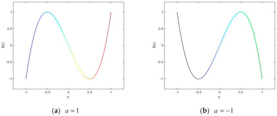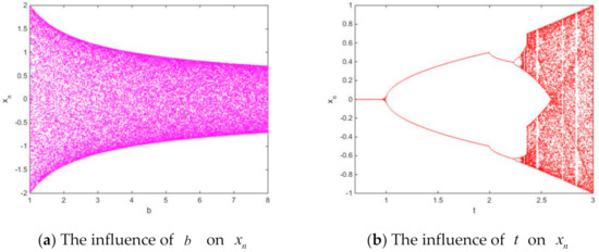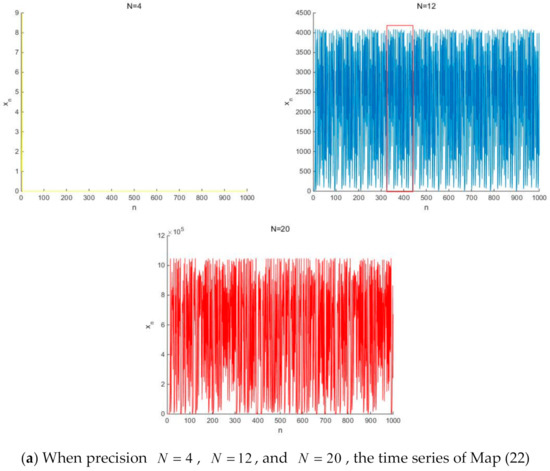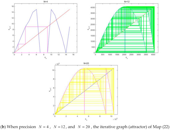First, the Boolean function of the iterative Map (23) is analyzed in the view of binary. There are only multiplication, addition, and subtraction in Map (23). For any number , according to the properties of , we can obtain , where the symbol ““ is bitwise negation. Here, a concrete example of the symbol ““ is given. When , suppose , then the binary representation of is , and , . According to the conversion between decimal system and binary system, , then . Therefore, addition and subtraction can be converted to each other for the properties of , and there are only multiplication and addition in Map (23). In the addition of two multibit numbers, the carry of each single bit addition is added to the next-insignificance bit, and the multiplication also has a similar operation process. Multiplication and addition both satisfy the condition of Lemma 2.