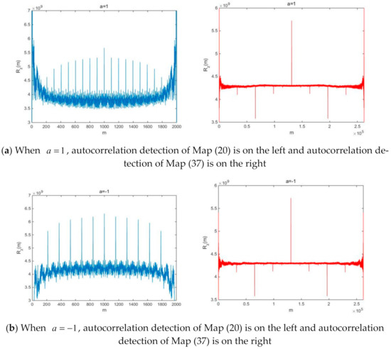 , the periods of the output sequences of Maps (20) and (37) are analyzed and distinguished. When the system precision is high, the period of sequence can be estimated by autocorrelation detection. Autocorrelation detection can reflect the dependence relationship of a signal between two different moments, which is an important detection method to evaluate the sequence period. The expression of the autocorrelation function is as follows: