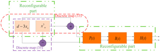 are shared reconfigurable modules. By reducing the repeated use of these two modules, hardware resources can be greatly saved. Compared with only one map, the number of output sequences can be further increased, and the randomness of output sequences can be enhanced by implementing two maps at the same time. The output sequences of Maps (33) and (35) undergo the same processing: module