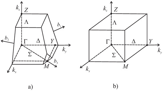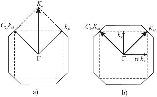 Inside the BZ in the majority of cases (but not in all) the spatial part of a singlet pair is even and spatial part of a triplet pair is odd. If IR is two-dimensional, one obtains from (7)–(9) that , and Hence, it follows that in this case even and odd IRs are mixed in the decomposition of symmetrized and antisymmetrized squares. The mixing of even and odd IRs takes place also in nonsymmorphic space groups on the surface of a BZ [40,41,48,49] due to non-trivial factor-system [41,48]. In the case of group the wavevector group H in point M is a group (see Figure 1b)), and IRs are projective [50]. In the case of projective IRs symmetrized (antisymemtrized) characters in the first item in r.h.s. of formula (11) are written as [41,49]: