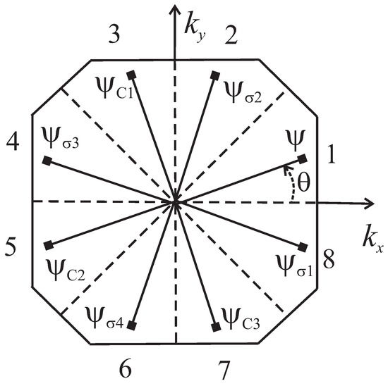 The pairs’ functions of and symmetry constructed from the basis set shown in Figure 3 making use of projection operators (17) are presented in Table 3. It is seen from Table 3 that the basis functions , and of the first row of , obtained by the action of , and rotations on the initial function , acquire phase factors i, and , respectively, i.e., correspond to magnetic quantum number . Basis functions of the second row, obtained by the action of the same rotations on the function , acquire phase factors , and i and correspond to magnetic quantum number . In the Ginzburg–Landau theory the SOP is identified with the wavefunction of a Cooper pair, which includes all pairs in the condensate. In the space-group approach this general pair function is obtained when the electron wavevector k runs in the sector (see Figure 3), and other sectors are brought about by left coset representatives. Suppose, that there is a phase winding in the first sector. It is natural to suppose that due to topological reasons In this case the functions in the sectors labeled by odd numbers in Figure 3 may be considered as possessing angular momentum projection . It is clear that reflection changes the direction of phase winding in sector 8 relative to sector 1, and the functions of even sectors possess angular momentum projection . In this technique the basis functions and their phases in the other sectors are obtained group theoretically by the action of left coset representatives.