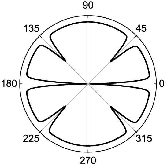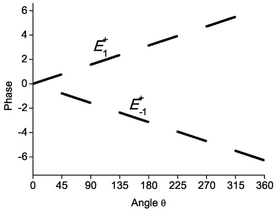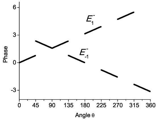 Basis functions of two rows of two-dimensional IRs are localized at different sectors in k-space and meet at vertical planes, where interference of pair functions occurs. In order to envisage such interference, the wave functions of pairs in a finite number of points were represented by normalized sum of real and imaginary Gaussians. Within the sectors the phases at neighboring points almost coincide, and constructive interference takes place. At the boundaries of the sectors, both constructive and destructive interference of the wavefunctions is possible. When squaring modulus of the complex function at every point we obtain the structure of SOP in the plane normal to the -axis. Nodal structures of IRs and , obtained by this numerical method presented in Figure 4, have nodes in plane and deeps in diagonal planes. Figure 5 shows the same for and , where line of nodes is in plane . Nodes in vertical coordinate planes are defined by additional quantum number, i.e., the sign of matrix (see Table 2). Nodes and deeps in diagonal vertical planes are the result of phase differences between two complex functions. In order to envisage the origin of these peculiarities, the phases of basis functions with and for and are presented in Figure 6 and Figure 7, respectively. Due to the same choice of left coset representative (denoted by superscript “+” or “−”) the results for and with the same superscripts coinside, and subscripts are dropped in Figure 6 and Figure 7. In Figure 6 near the positive direction of x- axis the phases of functions at and at are the same ( denotes small positive angle) and the phase was added to the function for convenience. On a clockwise path from 360 to 90 the phase winding of function is , and the total phase is The phase winding on the counter-clockwise of the function on the path from to 90 is . Thus, the total phase difference is , and interference is destructive at 90. Similar estimation at 45 results in phases of the first and second function and , respectively, resulting in constructive interference of real parts, destructive interference of imaginary parts and deep (not node) of SOP. Figure 7 shows the case in which reflection changes the phase, and the interference pattern is rotated by 90. Note that a similar interference pattern was obtained for complex odd IR without phase winding [23].