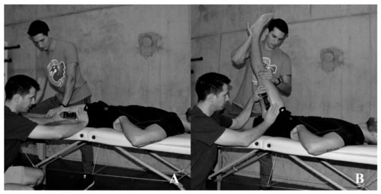 Participants passive hip RoM (°) was calculated with the help of digital inclinometer (Baseline, Fabrication Enterprises Inc., White Plains, NY, USA) and handheld goniometer (Baseline, Fabrication Enterprises Inc., White Plains, NY, USA). To minimize error, participants were marked with anatomic points specific to each test. To minimize subjectivity, examiner was assisted, which assured good fixation of instrument. Hip flexion and extension were measured with inclinometer, which was positioned to follow the line between femur trochanter major and lateral condyle of tested leg. Hip internal and external rotation were measured with inclinometer, which was positioned at center of tibia. Hip abduction and adduction were measured with a goniometer, fixed arm was pointed toward the other anterior superior iliac spine, and adjustable arm was pointed toward the tested leg patella. Hip flexion (Figure 1A) measurement started with participant lying in supine position with non-tested leg fully extended and fixated on the ground. Examiner would move tested leg into hip flexion, ensuring knee extension throughout whole movement, and end of motion was determined by the first pelvic movement (Figure 1B). Hip extension measurement started with participant lying in prone position with non-tested leg fully extended and fixated on the ground and tested leg in knee flexion (~90°). Examiner would move tested leg into hip extension, and end of motion was determined by the first pelvic movement. Hip internal and external rotation measurement started with participant lying in prone position with non-tested leg fully extended and fixated on the ground and tested leg in 90° knee flexion. Examiner would internally/externally rotate the leg ensuring 90° knee flexion, and end of motion was determined by the first pelvic movement. Hip abduction measurement started with participant in supine lying position with legs in neutral position, examiner would abduct the tested leg, end of motion was determined by the first pelvic movement. Hip adduction measurement started in supine lying position with tested leg in neutral position and non-tested leg lying off the table in ~30° abduction. Each movement/leg was tested three times, and mean result was taken for analysis.