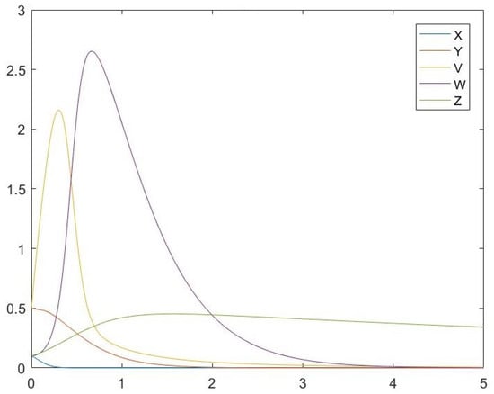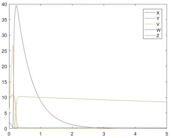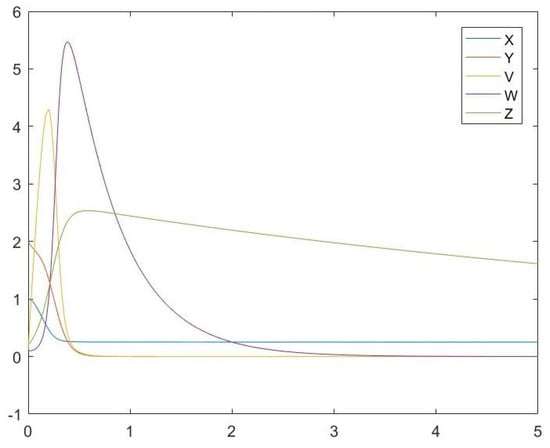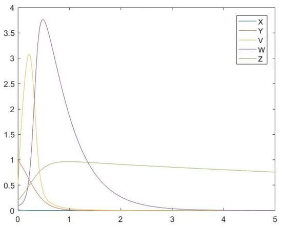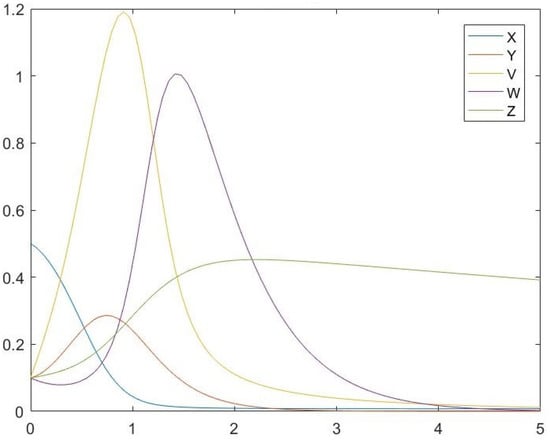 This model presents five equations with five variables that describe the status of the virus–host system on each time. These variables are uninfected cells, infected cells, free virus numbers, antibody response, and CTL response denoted, respectively, by X (cells/mL), Y (cells/mL), V (IU/mL), W (IU/mL), and Z (cells/mL).