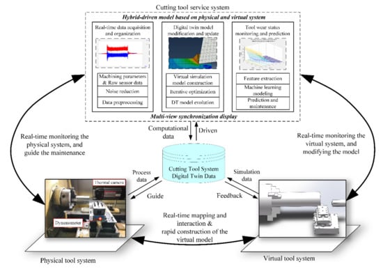 Generally, all components of the framework are associated closely with each other. As the foundation of the digital model, the physical tool system generates a significant amount of process data that are transported to the virtual tool system. With the data from the physical system and domain knowledge, rapid construction of the virtual model is proceeded to mirror the actual cutting process. Subsequently, the data generated by the virtual tool system are transported to the cutting tool service system in a timely manner, together with the data from the physical system. In the cutting tool service system, a hybrid-driven model is built: firstly, all raw data from the physical and virtual systems are processed to eliminate noise and interference signals; secondly, the virtual system is modified by comparing the error between the physical and virtual systems, thereby realizing the evolution of the DT model; finally, the tool wear status is predicted based on the extracted data with the help of machine learning algorithms. Data visualization is performed, where data are shown in the physical entity and virtual simulation views, yielding a multi-view synchronization interface. The service system feeds back real-time manufacturing commands to the physical and virtual tool systems, after which the virtual tool system can predict the cutting tool wear degree and guide the actual manufacturing process in the physical system. All generated data are stored in the DT dataset.