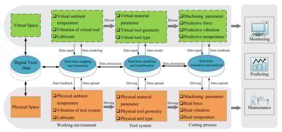 Digital Twin (DT) technology provides a solution to the aforementioned problems in tool wear monitoring. The theory of DT has been utilized gradually in product design, manufacturing, and service since it was first proposed by Grieves in 2003 []. A typical definition of DT acknowledged by most scholars is that DT is an integrated simulation of multi-physics, multi-scale, multi-domain, and multi-context for a product or process based on fully utilizing data from the physical space and mapping the physical characteristics into the virtual space. Using DT technology, not only can the exact match between physical system and virtual model be conducted, but decisions can also be transferred from a virtual space to a physical space []. During cutting, the symmetrical DT model can be optimized continuously to keep consistency with the physical system such that it achieves higher accuracy and fidelity. Subsequently, the simulation data are processed to predict the tool wear value, and the results are returned to the physical system to guide tool substitution. Hence, DT can realize a more accurate monitoring and prediction of tool wear over time.