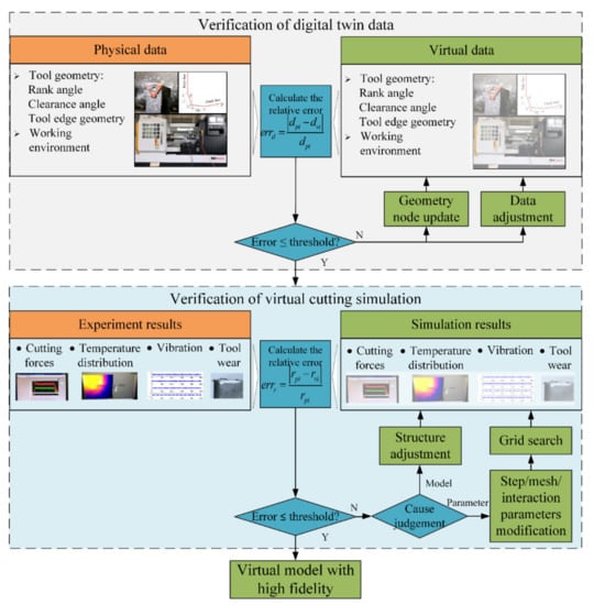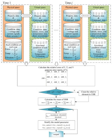 After modifying the cutting tool system of the virtual model, the fusion of the massive multi-source heterogeneous data is conducted, as shown in Figure 6. During cutting, the property data and command data from the physical space are matched with those of the virtual space at time t. In the physical system, voltage and current signals from sensors reflect the cutting force and temperature in-formation of tool system. Before experiments, the relation between voltage and force can be defined by the calibration test. In this case, the real cutting tool condition, such as the cut-ting force and temperature, can be calculated. In virtual space, the stress, strain, and temperature can be simulated, and the simulated condition (cutting force and temperature) of virtual cutting tool can be obtained directly. Then, the relative error of force, temperature, and vibration can be calculated respectively. The errors from time 1 to j and the j*3 error matrix are obtained, expressed as: