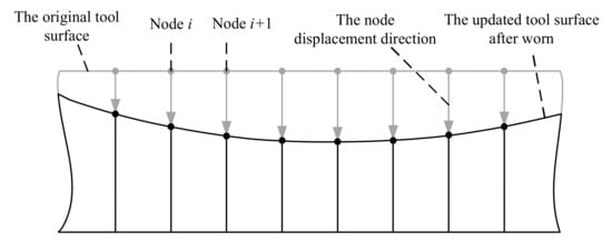 Firstly, data pertaining to the virtual model that belong to the factors affecting the cutting process performance are verified. Some of the DT data are offline data that could not be modified during cutting and need not be modified in real time. The other set of dynamic data reflect the tool wear condition, such as the tool geometry data and environment data. The real-time relative errors of the dynamic data are calculated using Equation (15), where dpi and dvi are the ith index of the physical and virtual models, respectively. After tool wear occurred, the original tool surface deformed, and the nodes on the original face also have a displacement. If the relative errors of geometry size reach the predefined threshold, the node of the tool surface will be updated to modify the virtual geometry model until the errors are sufficiently small. The updating scheme for the node is shown in Figure 5. If the environmental relative error reaches the set threshold, then the responding parameters in the virtual environment model will be adjusted to reduce the error.