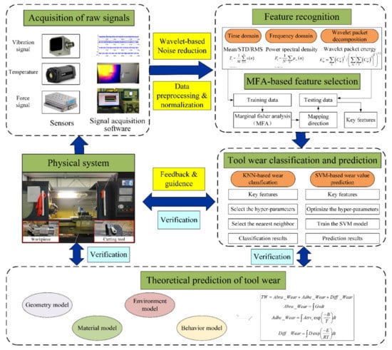 - In the cutting process layer, all sensors extract data, including the cutting force, temperature, and vibration from the physical cutting process. Meanwhile, real-time simulation in the virtual space continues incessantly. The virtual cutting process is modified iteratively by comparing the data error between the physical and virtual tool systems. Following this, the tool wear status is monitored and predicted using machine learning method based on DT data, thereby realizing the maintenance of the worn cutting tool in real time.