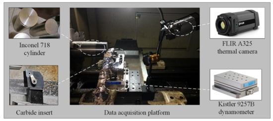 The data acquisition platform includes a CNC lathe, diamond carbide insert tool, Inconel 718 bar, and sensing devices, as shown in Figure 8. The three-direction force during the cutting process is measured using a Kistler 9257 B dynamometer. Considering the effect of temperature on tool wear, the temperatures of the tool and workpiece is measured in real time. In this platform, a FLIR A325 infrared thermal camera is chosen for convenience. After dismantling the knife tower, a dynamometer is installed on the workbench. Subsequently, a tool holder is installed on the dynamometer by a customized fixture.