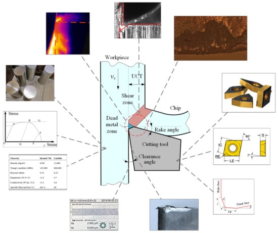 It can be observed that the cutting process is a thermal-mechanical coupling process. During the turning process, elastic and plastic deformations occurred, and a significant amount of heat is generated simultaneously. In the symmetrical model of the tool system, a simulation model coupled with dynamics and thermodynamics is developed. A simulation is conducted to resolve the force and temperature during the cutting process. Considering that the strain along the cutting speed and feed directions is much larger than that in the other directions, the strain in the radial direction of the workpiece is negligible. Therefore, the turning process of diamond inserts can be simplified to orthogonal turning problems in this study, as shown in Figure 9. The high-fidelity geometry model and material model are first established, in which the material properties are consistent with the physical entities, as shown in Table 6. Following this, a high-fidelity environment is established.