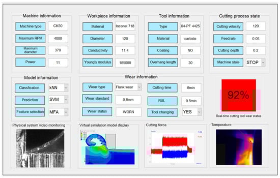 A terminal display and control system is provided to tool users to observe the tool condition in real time such that timely decisions can be realized. The system integrates the cutting process information interface, dynamic video screen monitoring interface, virtual model interface, and tool condition plot. As shown in Figure 10, the multi-view synchronization tool wear real-time monitoring interface is presented in a user-friendly display. The real-time tool wear state data and cutting process data are shown at the interface. After cutting tool failures, maintenance warnings will be provided, thereby allowing operators or manufacturers to conduct the maintenance accordingly, e.g., tool replacement and grinding.