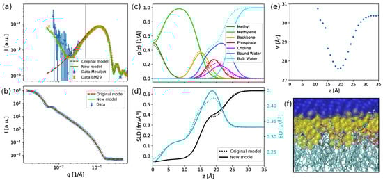 We first implemented the SDP model for a spherical-shell bilayer (i.e., a vesicle) using the separated form factor method [], which extended the analysis to previously unconsidered low scattering vectors q (see Section 4.3 and Appendix A) and performed a test on the benchmark-lipid DPPC. Using published parameters [], the model fits very well to the SANS data herein, but not to the low-q region in SAXS (Figure 1a,b). In particular, the SAXS intensity minimum at Å−1 is completely missed by the fit, while a good agreement is obtained for Å−1, i.e., the q-range reported previously []. We also measured an independently prepared sample of DPPC using a SAXSpoint laboratory camera. Although these data are intrinsically more noisy, particularly at a low q, they clearly agree with synchrotron data and demonstrate that the mismatch of the previous data modeling is a salient feature. Fits to this region have, however, been attained by other models, which unlike SDP, do not depend on the specific composition of the lipid bilayer [,]. This indicates that the solution might be an additional degree of freedom in the scattering length density (SLD) profile. Indeed, we found that increasing the contrast in the headgroup region, e.g., by decreasing the headgroup volume, drastically improves the agreement to low-q SAXS-data, while having no significant impact on the neutron form factor (data not shown). Note that a similar approach was reported in []. An alternative and physically realistic way to do this is to account for the layer of bound water molecules (Figure 1c,d). In this model, we assumed that the water molecules surrounding the polar headgroup take up a more ordered structure than in the bulk, leading to a higher density in this region. Hydration shells of this kind are extensively used for SAXS data analysis of protein solutions [,] and have also been predicted for lipid membranes []. We implemented hydration water using an error function that adds one layer of more dense water to the water accessible groups of the lipid bilayer as detailed in Section 4.3 and Appendix A. Our fit estimates the water density in this shell to be 3% higher than in the bulk, which agrees with previous reports on hydration shells for proteins or nucleic acids [,]. This increased water density between the headgroups can also be found in all-atom MD simulations (Figure 1e,f and Figure A5), where the volume of water molecules near the lipid headgroups decreased by up to 10% compared to the bulk value.