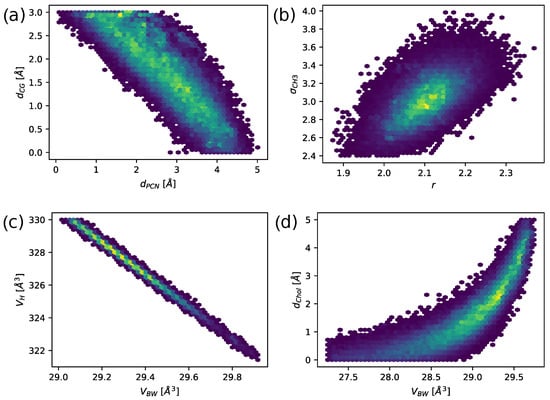 Exemplary parameter correlations in the joint SAXS/SANS-analysis of DPPC vesicles, visualized by MCMC sample histograms. Colored spots correspond to Monte Carlo samples: the brighter the color, the more the samples are contained in the point, thus corresponding to higher probability: (a) shows the correlation between the positions of the carbonyl-glycerol and the phosphate group; (b) between terminal methyl relative volume r and distribution width ; (c) between volume per bound water molecule and headgroup volume (with constant headgroup structure); and (d) between and the position of the choline-CH3 group (with constant ).