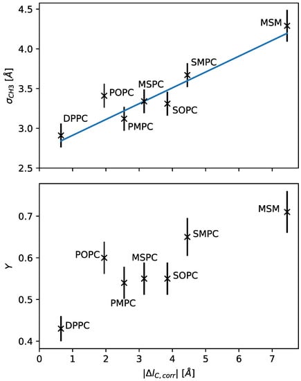 The extreme states (Y = 0, 1) are most likely purely theoretical. is around 1.4 Å for the studied lipids, while results from Section 2.2 suggest that Å for PC-lipids. Moreover, the -values of other molecular groups also lie far above this value, suggesting that overall fluctuations of the molecules will not permit localization to such an extent. On the other hand, for Y approaching 1, the probability distribution of the CH3 group might no follow a Gaussian shape. In intermediate cases, as for systems used in this study, Y could mark a major characteristic of a bilayer. Here, our results suggest that the relative dislocation of the chain termini also monotonously increases with hydrocarbon chain mismatch (Figure 3), and can reach up to ~70% of hydrocarbon chain thickness. POPC, interestingly, does not fit into this picture, having within experimental uncertainty a relative chain overlap similar to that of SOPC or SMPC. This is most likely a signature of the unsaturated hydrocarbon, which increases due to its kink at the cis double bond the width of the distribution of the terminal CH3.