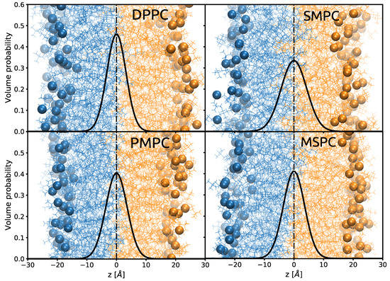 Snapshots of MD simulations for saturated phosphatidylcholines. Spheres mark the positions of phosphorus. The overlaid graphs represent the volume probability distributions of the CH3 groups, summed over all lipids in the bilayer.