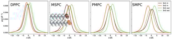 All simulations were run with the NAMD software [] and the CHARMM36 force field for lipids [,]. Each of the bilayer systems, excluding DMPC, was energy minimized for 1200 steps, then simulated for a total of 1 ns with an integration time-step of 1 fs before the production run which employed a time-step of 2 fs. DMPC was equilibrated following CHARMM-GUI’s 6-step equilibration protocol. All simulations were run at a constant temperature of 50 °C (323K) and a pressure of 1 atm maintained by NAMD’s Langevin thermostat and Nose–Hoover Langevin piston, respectively. Long-range interactions were modeled with a 10–12 Å Lennard-Jones potential using NAMD’s vdwForceSwitching option. All hydrogen bonds were constrained with the rigidbonds parameter set to all and electrostatic interactions were modeled using the particle mesh Ewald (PME) method with a grid spacing of 1 Å. The four simulations were run for a total of 1 μs (MSPC), 0.969 μs (PMPC), 1.03 μs (SMPC) and 0.8 μs (DMPC). The first 50 ns were discarded and the rest were used to calculate the number density profile of each system with the density plugin in VMD []. The calculation was done at a resolution (slab thickness) of 0.2 Å on trajectory frames spaced 100 ps apart. For comparison, a system of a DPPC bilayer simulated under the same conditions was taken from [] and its number density profile was calculated following the same procedure.