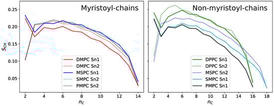 Another effect of the hydrocarbon chain mismatch can be seen in the orientational order parameter of the hydrocarbons, which was also derived from MD simulations (Figure 6). This dimensionless number represents the average orientation of the respective C–H bonds relative to the bilayer normal [] and approaches 1 for perfectly ordered chains. Hydrocarbons are labelled by the number , starting with 1 at the ester bond. In the case of chain-symmetric lipids, the strength of the attractive van der Waals interactions between the hydrocarbon chains increases with chain length, leading to a higher ordered state, as can be seen in the example of DMPC (14 carbons/chain) and DPPC (16 carbons/chain). If there is a chain length mismatch, however, the longer chain lacks its direct neighbor at its tip, decreasing its order. In fact, order parameters of the longer chains in MSPC, SMPC and PMPC are close to the ones of DMPC for low and well below those of DPPC. Again, we see a difference between MSPC and SMPC: due to the glycerol-tilt, the 18:0 chain in MSPC has a lower effective length difference to its 14:0 chain and is therefore more ordered than in SMPC. On the other hand, the behavior of the short myristoyl-chain is almost identical for all lipids, as they all have a long neighboring chain to optimize van der Waals’ interactions. Solely the sn1-chain in DMPC, again being longer than its sn2 due to the glycerol-tilt, has slightly lower order parameters.
