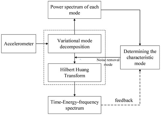 Since VMD could weaken the inherent end effect and mode aliasing of EMD, a new approach of VMD–HHT time–frequency analysis is suggested in this paper by replacing EMD with VMD. First, the acceleration data were decomposed using VMD. Secondly, the power spectrum density (PSD) was used to extract each mode frequency. As a result, the frequency range of dynamic responses could be defined, and the noise modes were eliminated. Then, the time–frequency–energy spectrum could be gained by employing HHT to extracted modes. Lastly, assisted by the spectrum to adjust and determine feature modes, characteristic information of dynamic responses with high accuracy could be obtained in all directions. Figure 1 shows the process of the VMD–HHT-based characteristic extraction model.