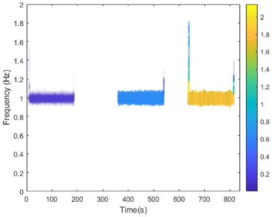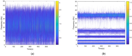 As shown in Figure 3, HHT cannot extract characteristic information of accelerometer signals. In contrast, the VMD–HHT model can accurately separate frequencies of analog signals into each band (separation frequency is consistent with setting frequency) and qualitatively analyze frequency distribution of energy based on color. Moreover, the analog data were made up of time-invariant stationary signals with constant statistics along the time axis. According to previous analyses and research, even for accessible composite signals, HHT cannot separate characteristic information effectively. Its algorithm EMD would cause mode aliasing, while the VMD–HHT would not. Therefore, this paper proposes an HHT method using VMD instead of EMD, from now on referred to as VMD–HHT time–frequency analysis model.