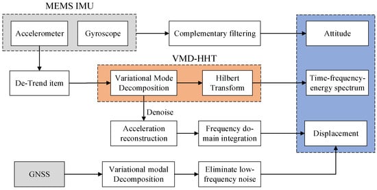 In this study, variational mode decomposition (VMD) was first verified to avoid mode mixing and end effects []. Then, a combined model of VMD and Hilbert transform (VMD–HHT) was established to extract time–frequency–energy characteristics. Meanwhile, we efficiently eliminated the noise component from accelerometer data according to extracted frequency range using VMD–HHT. Thus, displacement responses were calculated using the frequency-domain integration approach (FDIA) using the accelerometer data. Additionally, torsion angles were obtained by the complementary filtering algorithm based on six degrees of freedom data from the MIMU. A series of simulation shaking-table tests were performed using accelerom in the MIMU to verify the reliability of the VMD–HHT model and displacement reconstruction method. Finally, a field test in the offshore oil platform was conducted. The results prove that VMD–HHT can notably help extract time–frequency–energy characteristics and symmetric information of offshore oil platforms wholly and accurately and improve displacement calculation by FDIA. Moreover, dynamic displacement responses and torsion angle information of the offshore oil platform can be calculated by MIMU alone.