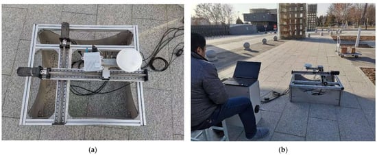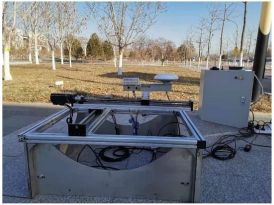 On 31 December 2020, the experimental measurements of dynamic displacement monitoring were carried out on the platform located in the south square of Beijing University of Civil Engineering and Architecture (BUCEA). The equipment used in the tests includes the shaking table, a GNSS deformation monitoring system independently developed by BUCEA, the ADIS16505 IMU (inertial measurement unit) produced by Analog Devices, Inc. (containing an accelerometer and gyroscope, but only the accelerometer data were used in this test) and laptops. The param of GNSS and accelerometer are shown in the following Table 1.