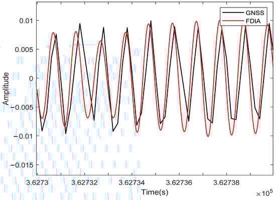 To assess the effectiveness and accuracy of FDIA based on the VMD–HHT model, displacements measured by GNSS are given for comparison. Firstly, the VMD approach was applied to remove residual and high-frequency noise from accelerometer data. Then, FDIA was used to obtain vibration displacements based on the cleaned data proposed by VMD. Figure 12 shows the displacement comparison of GNSS and FDIA; as seen from Figure 12, there is a high correlation between GNSS and FDIA. It is evident that the vibration amplitude is about 10 mm, and frequency is about 1 Hz, which is consistent with the set param. It can be concluded that VMD–HHT-based FDIA has successfully calculated the vibration displacements.