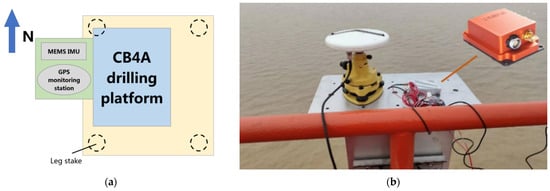MIMU used in the dynamic responses monitoring trial were from Mti300 inertial sensors by Xsens Technologies B.V. of the Netherlands (as shown in the upper right corner of Figure 14b). The specifications of Mti300 are given in Table 2. Furthermore, to demonstrate the accuracy and reliability of dynamic displacement responses by MIMU, a GPS monitoring system independently developed by BUCEA was installed on CB4A offshore oil platform. GPS RTK technology was used in this trial. The specifications of GPS are given in Table 3. The layout of the monitoring systems and the monitoring point for dynamic responses are indicated in Figure 14. Two sets of equipment were positioned at the northwest corner of the platform roof and attached to the roof railing by a sheet iron. The connecting line between the centers of MIMU and GPS antenna was directed toward the north–south. The MIMU was placed 20 cm to the north of the GPS antenna navigated by the NED coordinate system, and its X-axis was installed to the north.