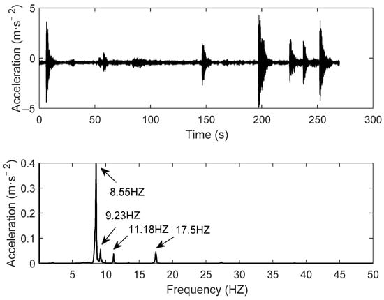 PSD was utilized to extract frequencies of dynamic responses of ship collisions, as represented in the bottom of Figure 15, where four peaks can be seen at 8.55 Hz, 9.23 Hz, 11.18 Hz, and 17.50 Hz separately, with the largest peak at 8.55 Hz. It could be concluded that much information was missing in the spectrum as (i) the sequence and time of collisions were unable to be identified corresponding to the four frequencies without the time-domain information in the spectrum and (ii) only four peaks were produced by eight ship collisions, which indicated the possibility of a common frequency phenomenon or the covering of high-power spectral density on the low-power ones. Therefore, PSD could not extract complete and reliable frequencies of dynamic responses for the ship collisions.
