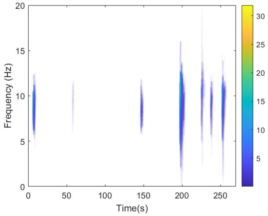 Time and frequency data are essential in investigating the dynamic responses of offshore oil platforms. To obtain high-precision dynamic displacement, extracting frequency dominant information is necessary, which can also act as a principal method to analyze dynamic response characteristics and structural symmetry. The fast Fourier transform (FFT) was traditionally applied to extract frequencies and amplitudes from monitoring datasets []. Nevertheless, FFT can neither extract local frequencies nor process nonstationary signals that constantly change []. The short-time Fourier transform (STFT) has been proposed to overcome such defects, allowing local characteristics of frequencies and amplitudes to be obtained using a moving window. STFT is also suitable for nonstationary signals as signals intercepted by the moving window can be regarded as linear []. However, neither FFT nor STFT can detect the relationships between time and frequency domains for time-varying signals.