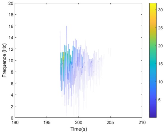 To further study the frequency characteristics of collisions in the time domain, the VMD–HHT method proposed in this paper was adopted to carry out a three-dimensional synchronous analysis of time–frequency energy. First, five IMFs were produced using self-adaptive VMD, as illustrated in Figure 16. All those functions contained dynamic responses of ship collisions, indicating the accelerometer’s high accuracy, which was unaffected by high- and low-frequency noise and could be directly reconstructed without denoising. Later, following the Hilbert transform of the reconstructed acceleration data, the Hilbert time–frequency spectrum was obtained, as shown in Figure 11. It was evident that seven collisions, along with each corresponding time, frequency range, and energy (collision intensity), were displayed synchronously, except that the frequency range of the fifth collision was found to be between 3 Hz and 15 Hz, while others were between 5 Hz and 12 Hz. Referring to the qualitative analysis of energy, the third collision (89 s) was invisible, indicating that its intensity was the smallest. Among the seven visible collisions (Figure 17), the intensity of the second collision was the lowest, consistent with the analysis results of the original data; the intensity of the fifth collision was the highest, and its enlarged view is reflected in Figure 18, while the collision lasted for about 7 s, and the intensity changed from high to low. In summary, this VMD–HHT-based method could accurately extract frequency ranges of collisions in the time domain and clearly characterize the intensities of each collision.