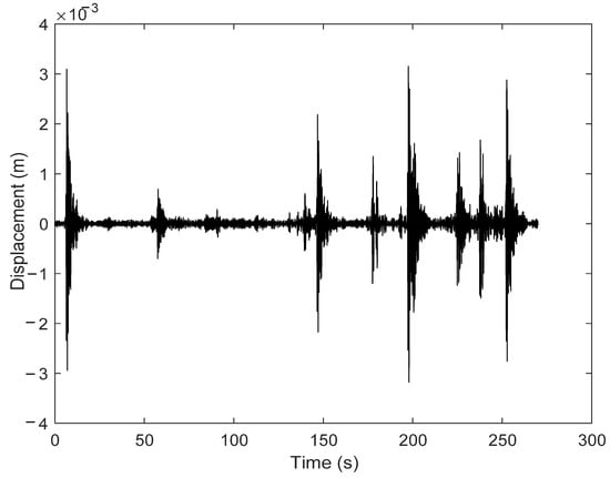 The frequency-domain integral equation is a powerful approach to process acceleration data using a double integral to reconstruct dynamic displacement information. According to the frequency range obtained through the VMD–HHT method, the minimum cutoff frequency was set as 1 Hz, and the maximum was set as 20 Hz. Figure 19 shows the accelerometer-derived displacement after double integration. We can observe that the displacement of the third collision (89th s) was minimal. Thus, the third collision on the platform was weak. Referring to the manual record, original data, and the HHT spectrum, the unknown displacement occurred at 180th s without any collision; the displacements of eight collisions were within 6 mm. Compared with related deformation data of bridges, high-rise buildings, and dams, deformation of the offshore oil platform collided by ships was smaller [,]. The reason for this is that the offshore oil platform was a stable rigid body, and the colliding ship was small when anticollision rubbers were tied to the platform pile.